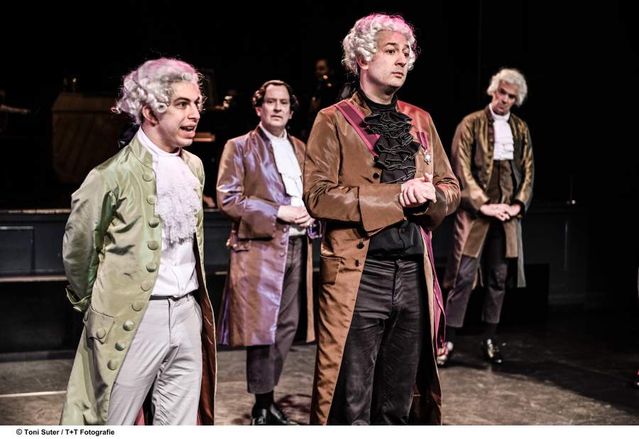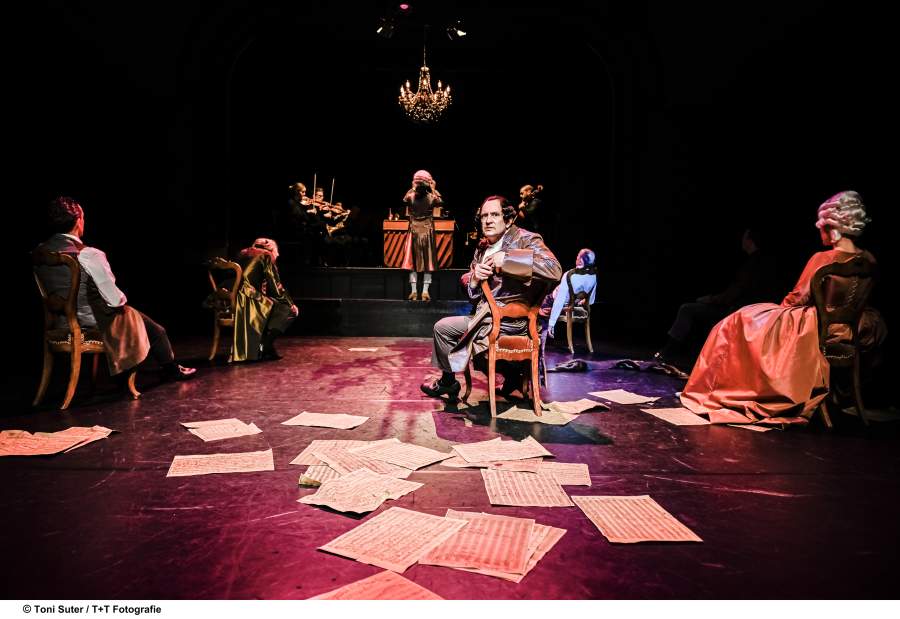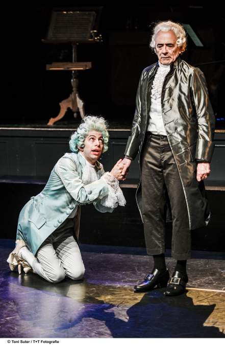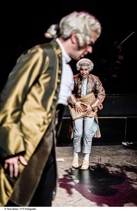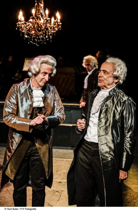 Ungerechtigkeit in der Verteilung von Gaben, die ein Mensch mitbekommt, und Mittelmass sind Themen, die ein Gros der Menschen tief berührt. Wir streben nach Erfolg und Ruhm und sind doch jeden Tag mit Mittelmass konfrontiert. Salieri erzählt in der Ich-Form als Lebensbeichte und macht den Zuschauenden zum Komplizen, indem er die Zuschauer auch zu „nur mittelmässig begabten“ und nicht von Gott auserwählten Menschen macht. Am Schluss des Stückes erhalten sie die Absolution.