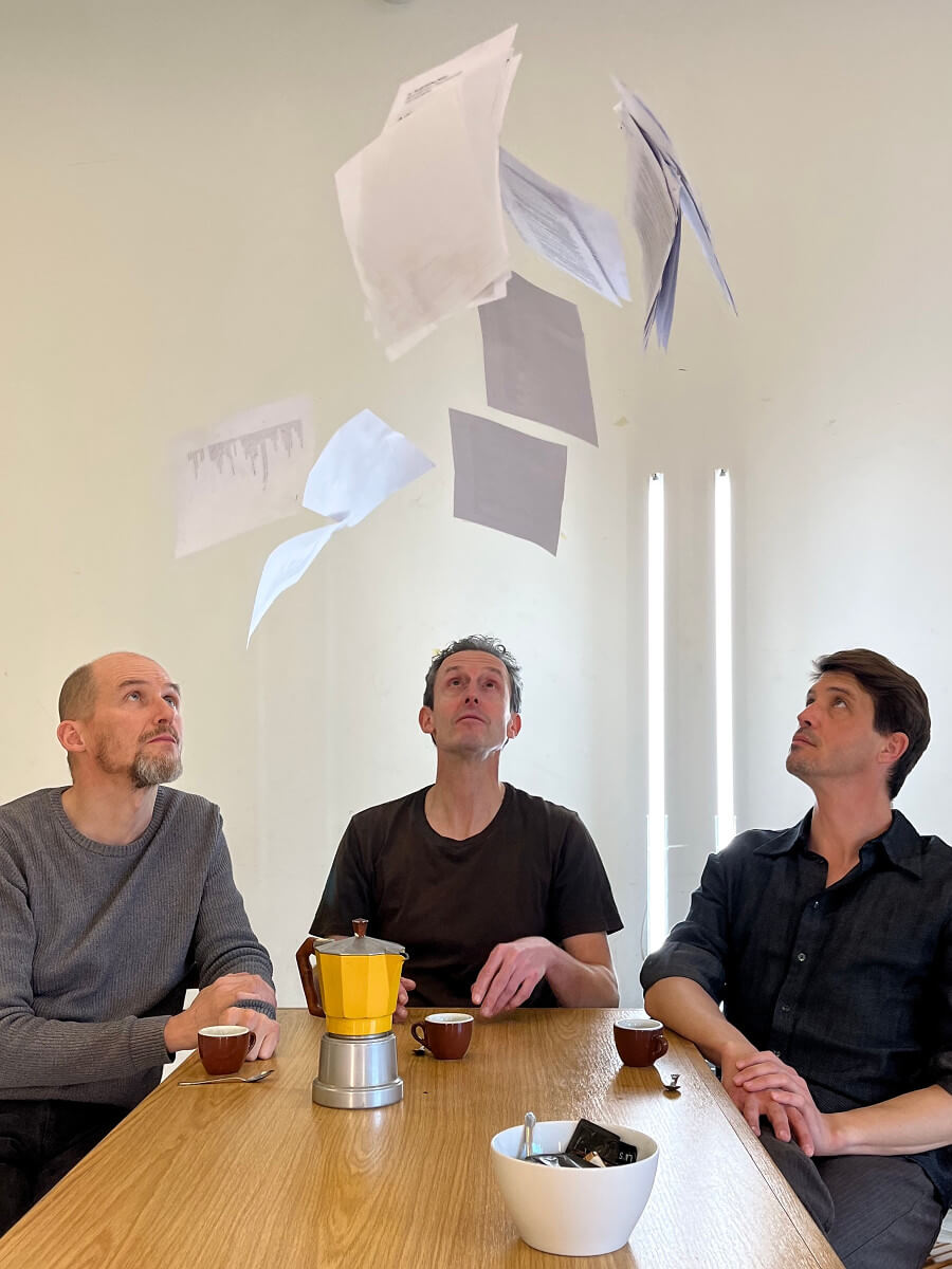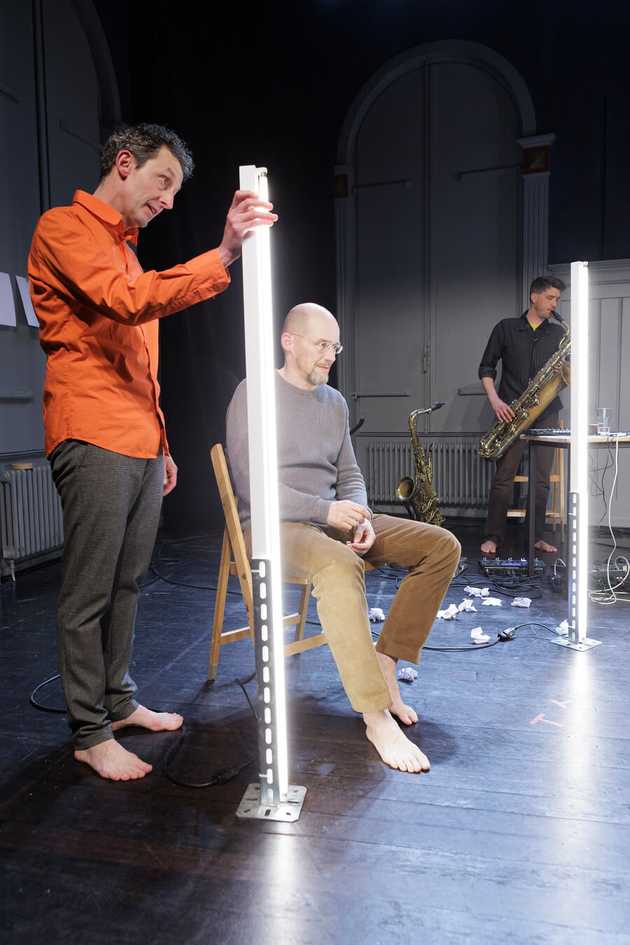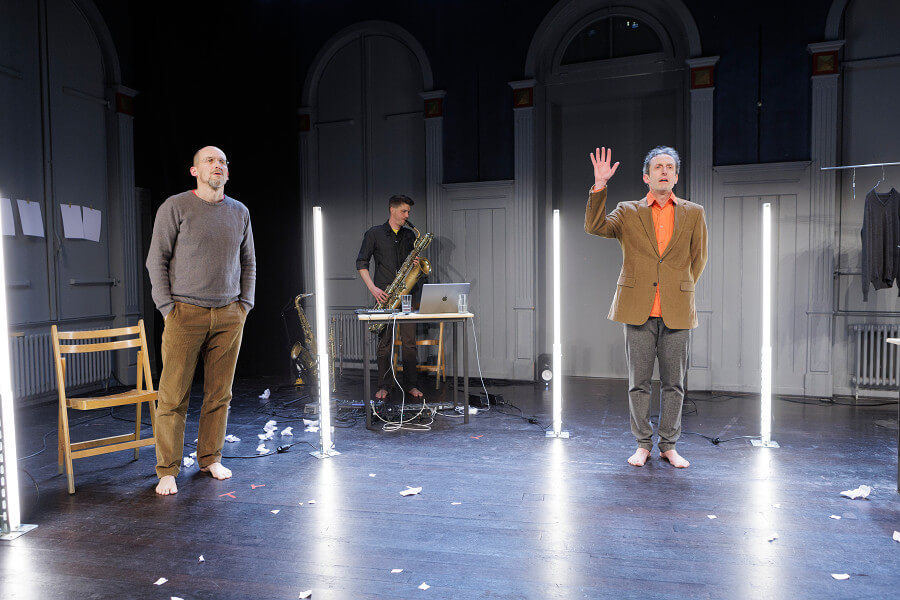 Im Publikum befindet sich ein zweiter Mann. Ihm scheint die Szene zu missfallen oder sie begeistert ihn. Er unterbricht. Er äussert sich, schlägt Änderungen vor oder befiehlt sie. Sie kommen ins Gespräch. Und in den Streit. Denn wie dieses Leben erzählt sein soll, das muss zuerst erinnert werden. Wie sich alles zugetragen hat, bleibt zu entscheiden. Das aber misslingt dem Mann im Publikum. Denn ein kurioses Trauma schlummert in den Tiefen der verschütteten Erinnerung.