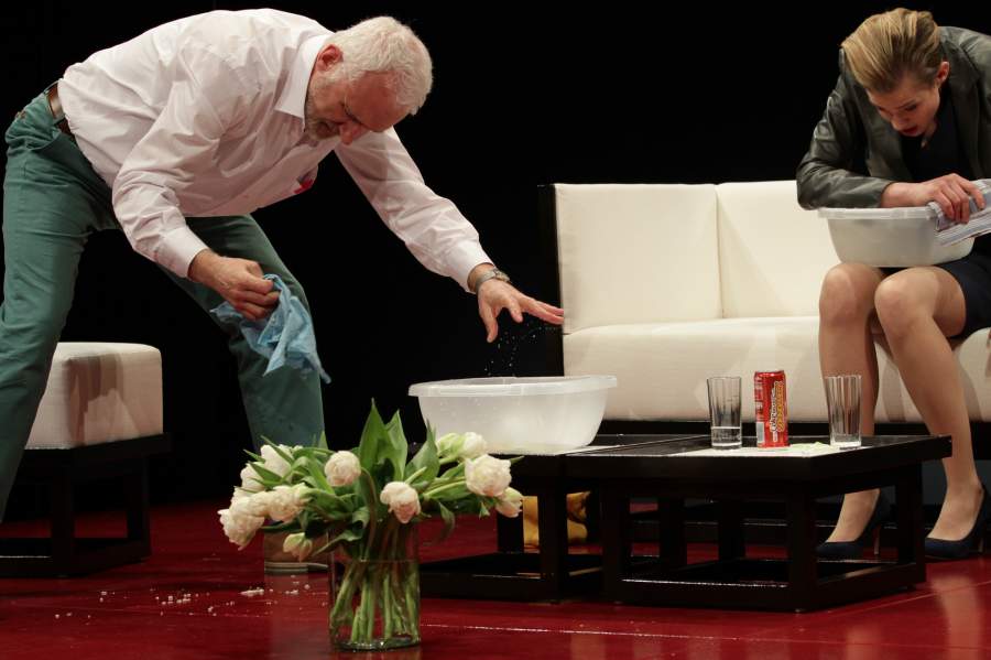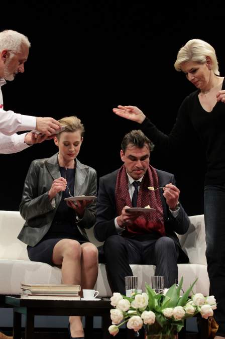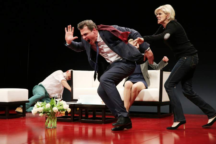 Von Sticheleien über Wortgefechte bis hin zu Handgreiflichkeiten, der Nachmittag gerät zur Saalschlacht: mit pointierten und geschliffenen Dialogen, getränkt von zunehmendem Rumgenuss ist das ein Vergnügen für vier Schauspieler – und fürs Publikum. Mit beissendem Humor fühlt Yasmina Reza in ihrem Erfolgsstück der modernen bürgerlichen Gesellschaft buchstäblich auf den Zahn, die Schneidezähne. Hin- und hergerissen zwischen vernünftigem Gutmenschentum und gewalttätigen Instinkten müssen ihre Protagonisten allerdings am Ende ernüchtert zur Kenntnis nehmen: So verbindlich und liberal-aufgeklärt wir uns auch geben, am Ende behält scheinbar einer die Oberhand: Der Gott des Gemetzels.