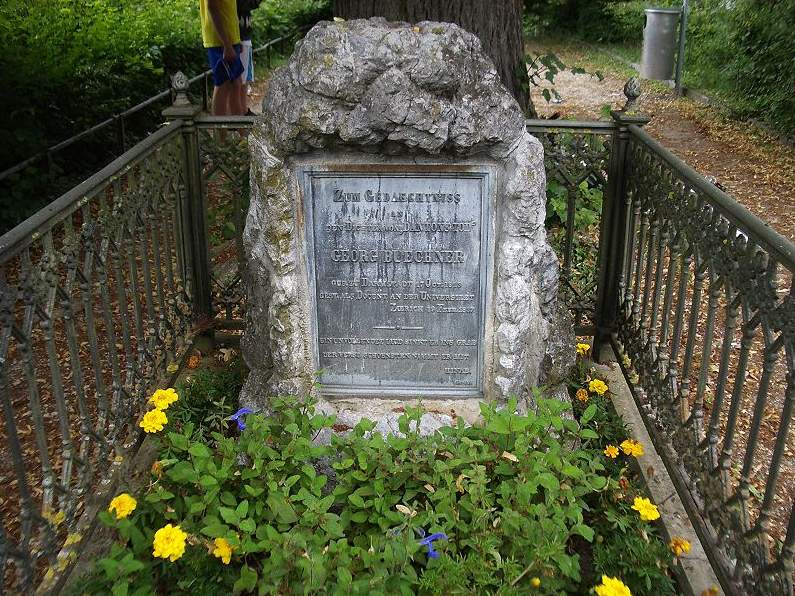 Georg Büchner starb am 19. Februar 1837 in Zürich an Typhus, nachdem er kaum vier Monate als Dozent an der jungen Universität Zürich gewirkt hatte. Beerdigt wurde er auf dem ehemaligen Friedhof Krautgarten, an der heutigen Krautgarten-Gasse. Als dieser Friedhof 1875 aufgehoben wurde, erhielt die «Gesellschaft deutscher Studierender in Zürich» die Erlaubnis, die Gebeine an ihren seit 1865 bestehenden Versammlungsort auf dem Germaniahügel zu überführen. Dort fand am 4. Juli 1875 im Beisein seiner Geschwister eine kleine Feier statt, die zugleich den Anlass für eine Neuausgabe seines bisher nur lückenhaft zugänglichen Werkes bildete. Herausgegeben von Karl Emil Franzos erschien diese neue Ausgabe 1879 im Verlag von J.D. Sauerländer in Frankfurt.